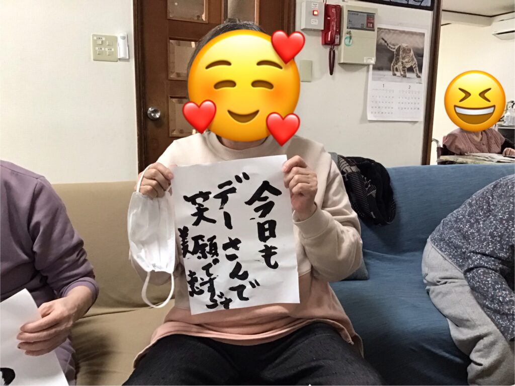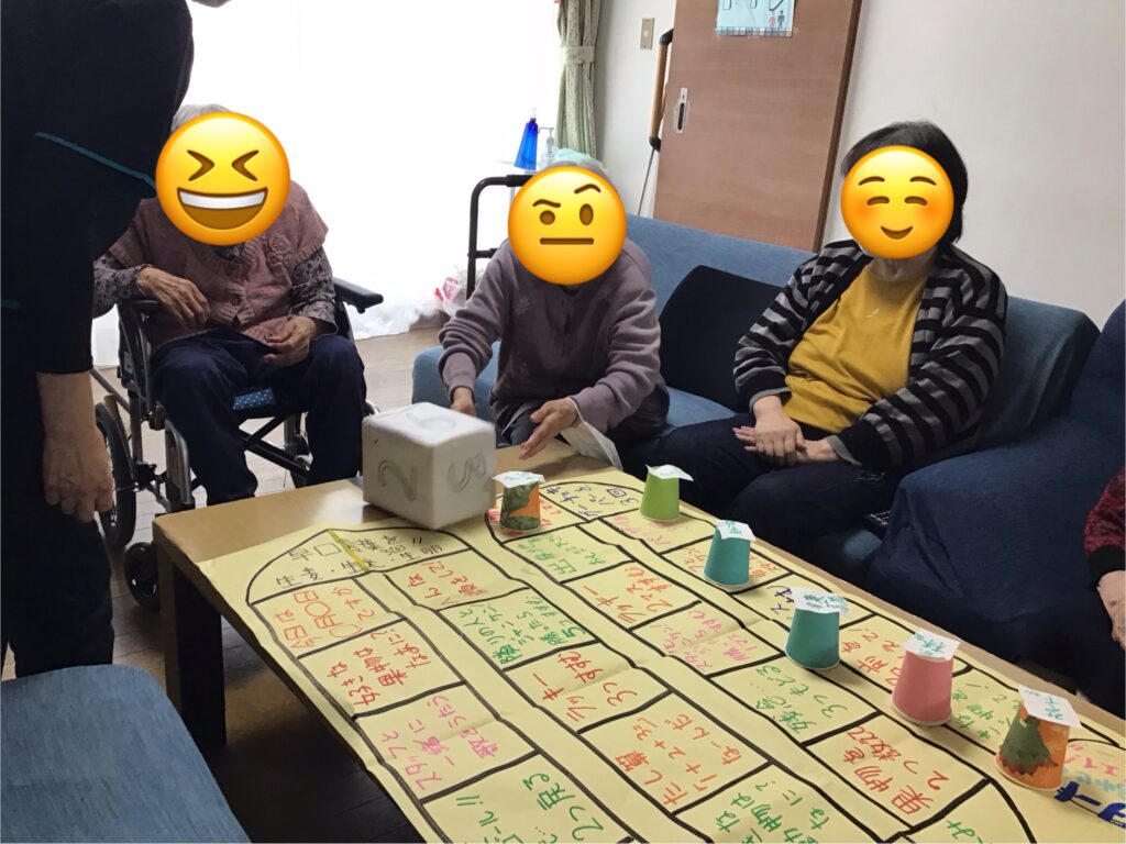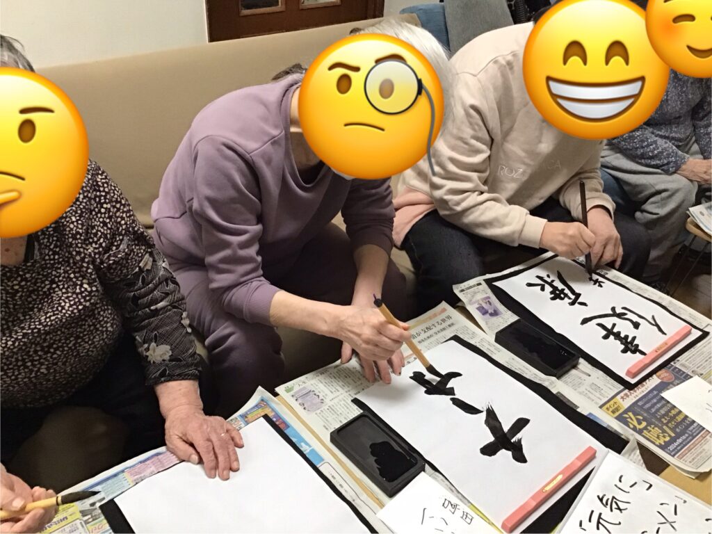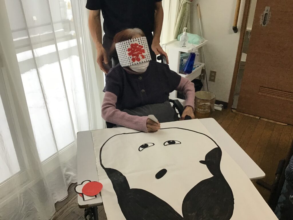 昔懐かしいお正月遊びにて、スゴロクに福笑いカルタに書き初めと室内で楽しめる事を皆さんと一緒に満喫致しました