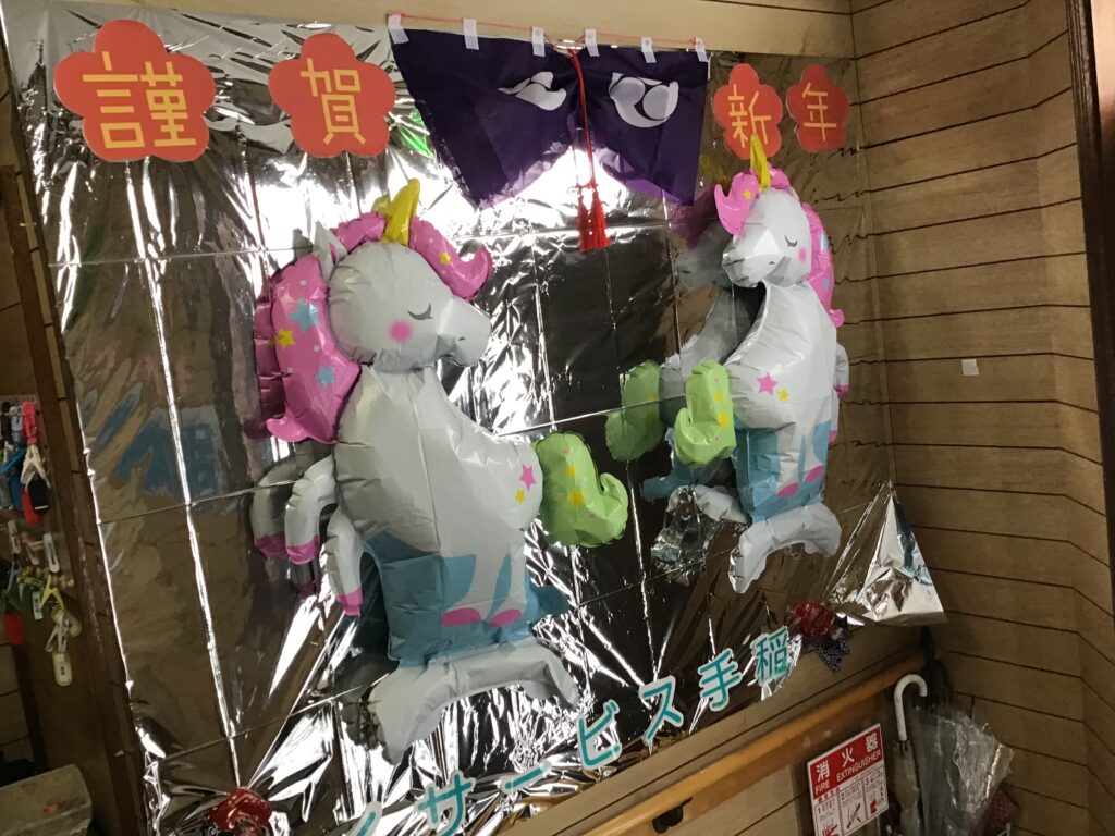 玄関扉にもお飾りをしっかり装飾後玄関中には午年🐴に因んで(馬が手に入らず)ユニコーン🦄も馬だよね?という事で玄関に鎮座しております🦄🦄💨目がチカチカしますが歳の初めで職員の気合いが入りすぎた事ご了承下さい💦💦🙇‍♀️