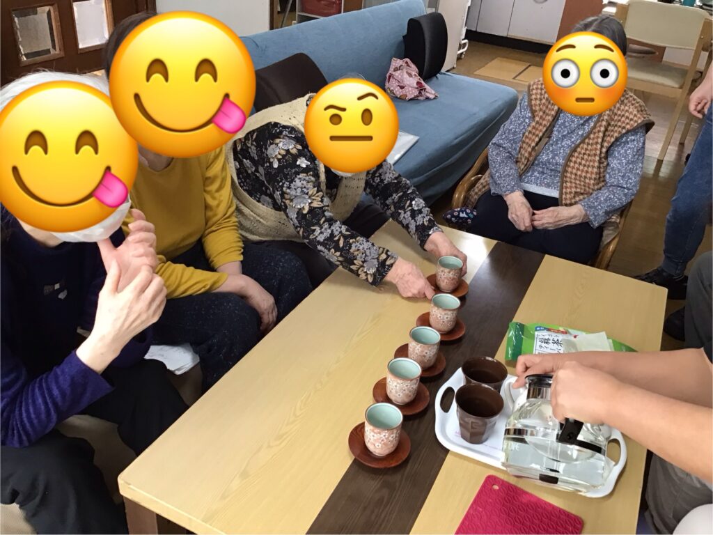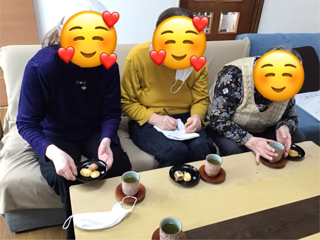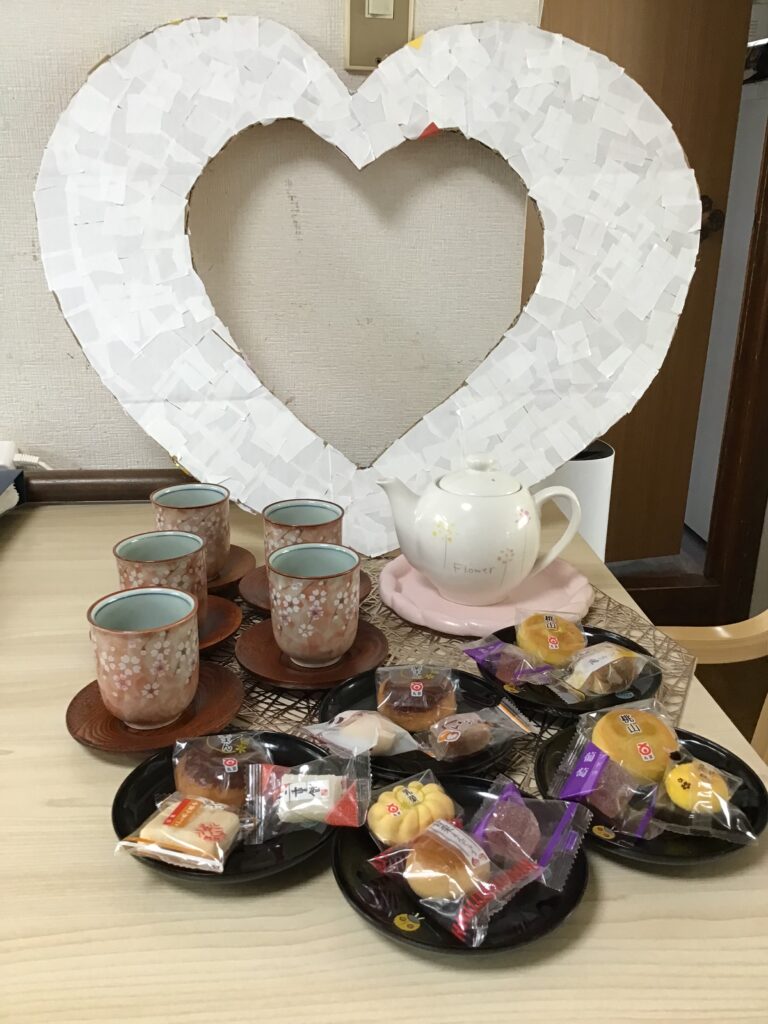 春のお彼岸の中日となるお彼岸に行事を行いました。先月牡丹餅の調理レクがあった為煎茶と和菓子を舌鼓され、春らしい飾り付けも作成致しました☘️